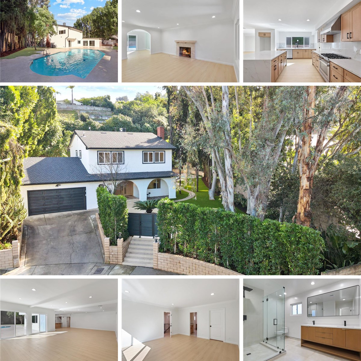 Tucked away on a quiet cul-de-sac South of Ventura Blvd in the Dona’s of Studio City, this gated and fully remodeled 4-bed, 3-bath, 2,928 sq ft home with a sparkling pool sits on a 19,715 sq ft lot, blending modern style, privacy and an indoor–outdoor lifestyle. Mature landscaping and a sweeping lawn enhance the estate feel, while wide-open living spaces and large sliding doors create a natural connection to the outdoors. The resort-style backyard features a pool, generous patio space and lush greenery - ideal for entertaining or unwinding in total privacy. Located north of Mulholland, the home is just moments from Ventura Blvd’s dining and shopping, with quick access to Hollywood, the Sunset Strip, West Hollywood and nearby Fryman Canyon hiking trails. Striking entry with a custom wood door opens to a spacious living room with fireplace, flowing into an expansive great room adjacent to the kitchen and large dining area, featuring double sliding doors overlooking the backyard and pool. The brand-new kitchen features a waterfall-edge island with quartz countertops, warm natural wood cabinetry and sleek black hardware. High-end stainless-steel appliances, including a professional-style gas range with custom hood, are complemented by a full-height quartz backsplash for a clean, contemporary finish. The primary suite is a true retreat, featuring a spa-inspired ensuite bath with a double vanity, custom wood cabinetry and an oversized walk-in glass shower with matte black fixtures. A custom walk-in closet with built-in shelving and drawers completes the suite, offering exceptional storage. In addition to the four beds and two baths upstairs, the main level offers an additional bathroom with shower, a second dining room ideal for a home office, a dedicated laundry room and direct access to the attached two-car garage. Additional upgrades include an updated HVAC system, fresh interior and exterior paint, double-pane windows, doors and a private driveway for extra parking. Located within the Carpenter Community Charter School district (tenant to verify). Experience the best of Studio City living!